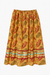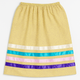 Three horizontal ribbon bands accent the lower part of the skirt, combining soft turquoise, gold, and deep burgundy tones that represent balance, strength, and connection to the land. The gathered elastic waistband provides comfort and flexibility, making it easy to wear for ceremonies, gatherings, or everyday expression.
